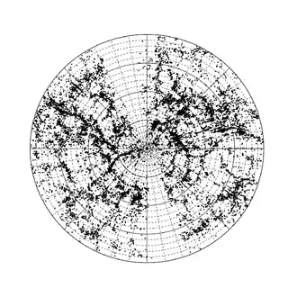 ![]() 6dF view with -10 - 0 degree (DEC), 360 degree (RA) and 0 - 200 Mpc radius. Each black dot represents a galaxy. | |