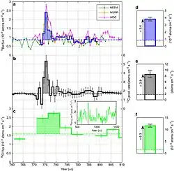 The 774–775 carbon-14 spike is an observed increase of around 1.2% in the concentration of the radioactive carbon-14 isotope in tree rings dated to 774 or 775 CE, which is about 20 times higher than the normal year-to-year variation of radiocarbon in the atmosphere. It was discovered during a study of Japanese cedar tree-rings, with the year of occurrence determined through dendrochronology.[1] A surge in beryllium-10 (10Be), detected in Antarctic ice cores, has also been associated with the 774–775 event.[2] The 774–775 CE carbon-14 spike is one of several Miyake events and it produced the largest and most rapid rise in carbon-14 ever recorded.[3][4]