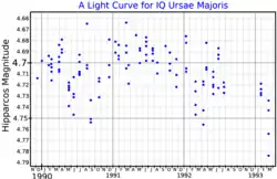 83 Ursae Majoris is a candidate binary star[12] system in the northern circumpolar constellation of Ursa Major. It is a semiregular variable star, and it has been given the variable star designation IQ Ursae Majoris. It ranges in brightness from apparent visual magnitude 4.69 to 4.75, making it visible to the naked eye under good observing conditions.[3] Percy and Au (1994) identified it as a small amplitude red variable with an irregular behavior, having a characteristic time scale of 20 days.[13] Based upon an annual parallax shift of 5.60 mas,[2] it is located roughly 580 light years from the Sun. The system is moving closer with a heliocentric radial velocity of −18.6[6] km/s.