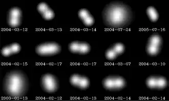 Since each component is about 86±1 km across, with their centers separated by only about 171 kilometers,[4] the gap separating the two halves is about the same as the diameter of each component. As a result, the two bodies orbit around the common center of mass which lies in the space between them. The orbital period is approximately 16.50 hours, and the eccentricity below 0.006.[4] Every several years, a period of mutual occultations occurs when the asteroid is viewed from Earth.[6] Using Kepler's third law, the mass and density of the components can be derived from the orbital period and component sizes.