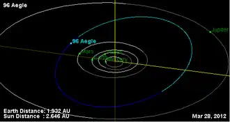 - 1 2 3 4 5 6 7 8 9 "JPL Small-Body Database Browser: 96 Aegle" (2018-01-24 last obs.). Jet Propulsion Laboratory. Retrieved 28 March 2018.