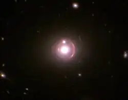 ASW0009io9 (9io9) is a gravitationally lensed system of two galaxies. The nearer galaxy is approximately 2 billion light-years (610 Mpc) from Earth and is designated SDSS J020941.27+001558.4, while the lensed galaxy is 10 billion light-years (3.1 Gpc) distant and is designated ASW0009io9 (shortened to 9io9).[5][2] It was discovered in January 2014 by a group of citizen scientists, while classifying images on the website Spacewarps.org.[5] The discovery was announced on the BBC television programme Stargazing Live.[5][2]