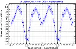 The black hole in A0620-00 pulls matter from the K-type star into an accretion disk.[4] The accretion disk emits significant amounts of visible light and X-rays. Because the K-type star has been pulled into an ellipsoidal shape, the amount of surface area visible, and thus the apparent brightness, changes from the Earth's perspective. A0620-00 also bears the variable star designation V616 Monocerotis.[6]