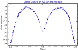 AB Andromedae (AB And) is a binary star in the constellation Andromeda. Paul Guthnick and Richard Prager discovered that the star is an eclipsing binary in 1927.[11][12] Its maximum apparent visual magnitude is 9.49 but shows a variation in brightness down to a magnitude of 10.46 in a periodic cycle of roughly 8 hours. The observed variability is typical of W Ursae Majoris variable stars,[3] so the two stars in this system form a contact binary.