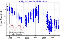 AB Doradus is a pre-main-sequence quadruple[5] star system in the constellation Dorado. The primary is a flare star that shows periodic increases in activity.
