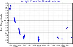 The star was discovered to be variable in 1927, with a photographic magnitude range of 15.3 to 16.5, at the Harvard College Observatory and designated HV 4013. It was considered to be the brightest variable star in M31.[9][10] Two years later it was given the variable star designation AF Andromedae.[11] Between 1917 and 1953, five or six major eruptions were detected and two or three minor ones. More eruptions were observed in 1970–74, 1987–92, 1998–2001, [8] and 2017.[12]