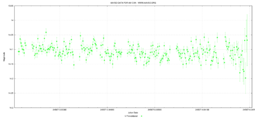 High speed photometry of the system shows multiple periods of variation in the luminosity. The main period of 1,028.73 seconds (17m 8.73s) is the orbital period of the pair.[14] A secondary period of 1,051 seconds (17m 31s) is believed to be caused by a superhump—an elevated outburst in the signal that occurs with a period slightly longer than the orbital period. The superhump may be the result of an elongation of the accretion disk in combination with precession. The elliptical disk precesses about the white dwarf over a time interval much longer than the orbital period, causing a slight change in the orientation of the disk over each orbit.[15]