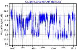 AM Herculis was first cataloged in 1923 by Max Wolf and was listed at the time as Veränderlicher 28.1923, which is now AN 28.1923 in the General Catalogue of Variable Stars. It was observed to be an irregular variable star ranging from 12 to 14 in apparent magnitude.[7] In 1976, the astronomer S. Tapia discovered that light from the star is both linearly and circularly polarized, showing that there was a strong magnetic field surrounding the system and revealing that the system was more complex than previously thought.[8][9][10]