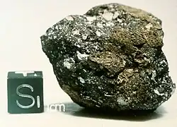 Meteorite next to a 1 cm sided cube. Found by ANSMET in the 1981-82 season. A Lunar meteorite