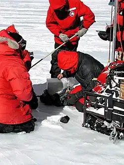The search for the meteorites is done visually. A team of four to ten explorers, typically meteorite scientists, lives for 5–7 weeks on the ice field. Using snowmobiles spaced 30 m apart they scan the blue ice for meteorites. Once a specimen has been located its position is found using GPS and it is given an identification number. It is then placed in a sterile Teflon bag. The teams make sure that the specimen remains frozen throughout its journey back to the Antarctic Meteorite Curation Facility at the Johnson Space Center in Houston, Texas. Since 1976, ANSMET has returned over 20,000 meteorites. Meteorites of greater interest and undergoing detailed study are kept at JSC for distribution to the scientific community, though, ultimately, all samples collected by ANSMET are transferred to the Smithsonian Institution for permanent storage and curation. These meteorites are housed at the Smithsonian Museum Support Center clean room facility at Suitland, Maryland, which is modeled after the Lunar Processing Laboratory at NASA’s Lyndon B. Johnson Space Center in Houston, Texas. Of the almost 16,000 Antarctic meteorites collected since 1976, over 14,000 have been permanently transferred to the Smithsonian.[3] Curators at the Department of Mineral Sciences at the National Museum of Natural History classify each representative chip of meteorite sent by NASA. Results and descriptions are published in the Antarctic Meteorite Newsletter, issued twice a year.[4]