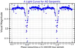 AO Serpentis is an eclipsing binary star system in the Serpens Caput segment of the Serpens constellation. It is invisible to the naked eye with a typical apparent visual magnitude of 11.04.[3] Variable star observers record a peak magnitude of 10.7, dropping to 12.0 during the primary eclipse and 10.8 from the secondary eclipse.[7] The distance to this system is approximately 1,450 light years based on parallax measurements.[2]