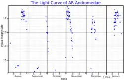 AR Andromedae (AR And) is a dwarf nova of the SS Cygni type in the constellation Andromeda. Its typical apparent visual magnitude is 17.6, but increases up to 11.0 magnitude during outbursts. The outbursts occur approximately every 23 days.[3]