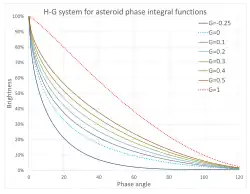 In 2012, the -system was officially replaced by an improved system with three parameters , and , which produces more satisfactory results if the opposition effect is very small or restricted to very small phase angles. However, as of 2022, this -system has not been adopted by either the Minor Planet Center nor Jet Propulsion Laboratory.[13][29]
