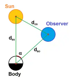 The absolute magnitude can be used to calculate the apparent magnitude of a body. For an object reflecting sunlight, and are connected by the relation where is the phase angle, the angle between the body-Sun and body–observer lines. is the phase integral (the integration of reflected light; a number in the 0 to 1 range).[13]