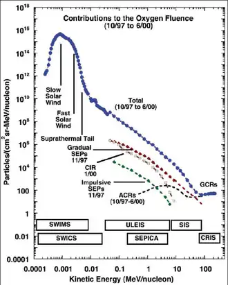 Figure 1 shows the particle fluence (total flux over a given period of time) of oxygen at ACE for a time period just after solar minimum, the part of the 11-year solar cycle when solar activity is lowest.[18] The lowest-energy particles come from the slow and fast solar wind, with speeds from about 300 to about 800 km/s. Like the solar wind distribution of all ions, that of oxygen has a suprathermal tail of higher-energy particles; that is, in the frame of the bulk solar wind, the plasma has an energy distribution that is approximately a thermal distribution but has a notable excess above about 5 keV, as shown in Figure 1. The ACE team has made contributions to understanding the origins of these tails and their role in injecting particles into additional acceleration processes.