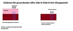 A large group of researchers discovered halos around fractures that they water existed in the ground long after water disappeared from Gale crater. Groundwater, carrying dissolved silica, moved in fractures and deposited silica there. This silica enrichment went across young and old rocks.[156][157]
