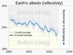 - ↑ Goode, P. R.; Pallé, E.; Shoumko, A.; Shoumko, S.; Montañes-Rodriguez, P.; Koonin, S. E. (2021). "Earth's Albedo 1998–2017 as Measured From Earthshine". Geophysical Research Letters. 48 (17): e2021GL094888. Bibcode:2021GeoRL..4894888G. doi:10.1029/2021GL094888. ISSN 1944-8007. S2CID 239667126.