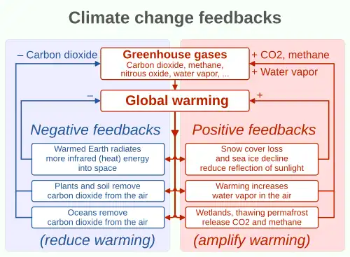The response of the climate system to an initial forcing is modified by feedbacks: increased by "self-reinforcing" or "positive" feedbacks and reduced by "balancing" or "negative" feedbacks.[39] The main reinforcing feedbacks are the water-vapour feedback, the ice–albedo feedback, and the net effect of clouds.[40]: 58
