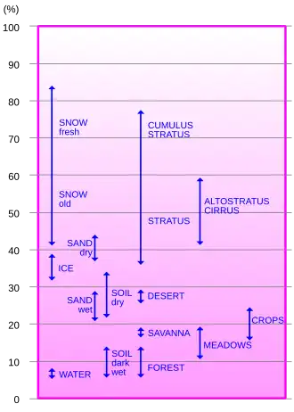 - ↑ Coakley, J. A. (2003). "Reflectance and albedo, surface" (PDF). In J. R. Holton; J. A. Curry (eds.). Encyclopedia of the Atmosphere. Academic Press. pp. 1914–1923. Archived (PDF) from the original on 9 October 2022.