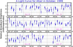 Satellite measurements made in 1999 with the Wide Field Infrared Explorer showed that the brightness of Altair fluctuates slightly, varying by just a few thousandths of a magnitude with several different periods less than 2 hours.[6] As a result, it was identified in 2005 as a Delta Scuti variable star. Its light curve can be approximated by adding together a number of sine waves, with periods that range between 0.8 and 1.5 hours.[6] It is a weak source of coronal X-ray emission, with the most active sources of emission being located near the star's equator. This activity may be due to convection cells forming at the cooler equator.[20]