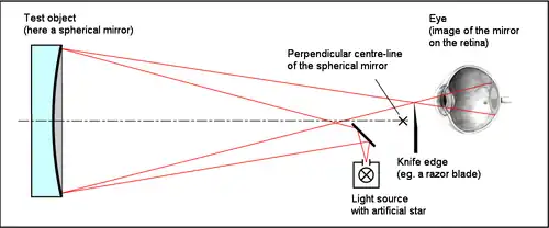 The equipment most amateurs use to test the shape of the mirrors, a Foucault knife-edge test, is, like the tools used to create the surface, simple to fabricate. At its most basic it consists of a light bulb, a piece of tinfoil with a pinhole in it, and a razorblade.