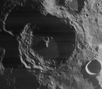 The inner floor is relatively flat, with a pair of central peaks near the midpoint. Much of the crater floor is cloaked in shadow during the lunar day, with only the southern floor and the central peaks receiving sunlight.