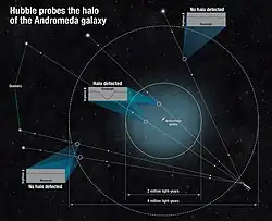 A study in 2005 by the Keck telescopes shows the existence of a tenuous sprinkle of stars, or galactic halo, extending outward from the galaxy.[10] The stars in this halo behave differently from the ones in Andromeda's main galactic disc, where they show rather disorganized orbital motions as opposed to the stars in the main disc having more orderly orbits and uniform velocities of 200 km/s.[10] This diffuse halo extends outwards away from Andromeda's main disc with the diameter of 67.45 kiloparsecs (220,000 light-years).[10]