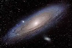 ![]() A visible light image of the Andromeda Galaxy and two satellite galaxies. Messier 32 is above the galactic nucleus and Messier 110 is at the bottom. | |
