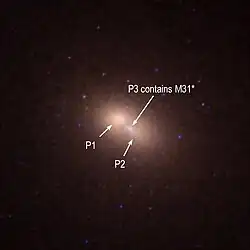 - ↑ Lauer, Tod R.; Faber, Sandra M.; Groth, Edward J.; et al. (1993). "Planetary camera observations of the double nucleus of M31" (PDF). Astronomical Journal. 106 (4): 1436–1447, 1710–1712. Bibcode:1993AJ....106.1436L. doi:10.1086/116737.
