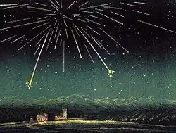 The first known sighting of the Andromedids was December 6, 1741, over St Petersburg, Russia.[6] Further strong showers were witnessed in 1798, 1825, 1830, 1838 and 1847. The Andromedids produced spectacular displays of several thousand meteors per hour in 1872 and 1885, as a result of Earth crossing the comet's debris stream. Schmidt, observing from Athens, said that the 1872 shower consisted mainly of faint (5th to 6th magnitude) meteors with "broad and smoke-like" trains and a predominantly orange or reddish colouration.[9] In England, Lowe estimated the same shower as producing at least 58,600 visible meteors between 5.50 and 10.30 pm, observed that the meteors were much slower than the Leonids, and noted noises "like very distant gun-shots" several times to the north-west.[10] In Burma, the 1885 shower was perceived as a fateful omen and was indeed followed swiftly by the collapse of the Konbaung dynasty and the conquest by Britain.[11]