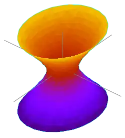 where is a nonzero constant with dimensions of length (the radius of curvature). This is a (generalized) sphere in the sense that it is a collection of points for which the "distance" (determined by the quadratic form) from the origin is constant, but visually it is a hyperboloid, as in the image shown.