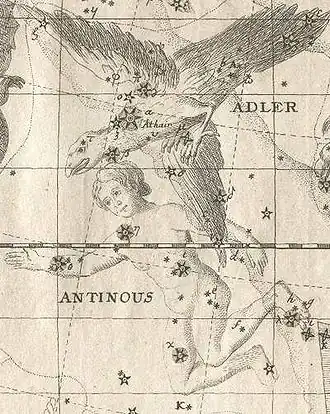 - ↑ An Outline Sketch of the Origin and History of Constellations and Star-Names Archived November 7, 2010, at the Wayback Machine by Gary D. Thompson, search for "Antinous"
