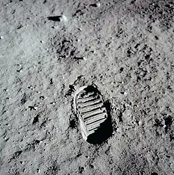 ![]() Buzz Aldrin on the Moon in a photograph taken by Neil Armstrong, who can be seen in the visor reflection along with Earth, the Lunar Module Eagle, and the U.S. flag.[1] | |