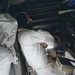 Inside the darkened spacecraft, the temperature dropped as low as 3 °C (38 °F).[140] Lovell considered having the crew don their spacesuits, but decided this would be too hot. Instead, Lovell and Haise wore their lunar EVA boots and Swigert put on an extra coverall. All three astronauts were cold, especially Swigert, who had got his feet wet while filling the water bags and had no lunar overshoes (since he had not been scheduled to walk on the Moon). As they had been told not to discharge their urine to space to avoid disturbing the trajectory, they had to store it in bags. Water condensed on the walls, though any condensation that may have been behind equipment panels[141] caused no problems, partly because of the extensive electrical insulation improvements instituted after the Apollo 1 fire.[142] Despite all this, the crew voiced few complaints.[143]