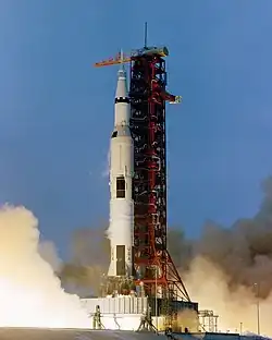 The Saturn V rocket used to carry Apollo 13 to the Moon was numbered SA-508, and was almost identical to those used on Apollo 8 through 12.[55] Including the spacecraft, the rocket weighed in at 2,949,136 kilograms (6,501,733 lb).[56] The S-IC first stage's engines were rated to generate 440,000 newtons (100,000 lbf) less total thrust than Apollo 12's, though they remained within specifications.[57] To keep its liquid hydrogen propellent cold, the S-II second stage's cryogenic tanks were insulated; on earlier Apollo missions this came in the form of panels that were affixed, but beginning with Apollo 13, insulation was sprayed onto the exterior of the tanks.[58] Extra propellant was carried as a test, since future J missions to the Moon would require more propellant for their heavier payloads. This made the vehicle the heaviest yet flown by NASA, and Apollo 13 was visibly slower to clear the launch tower than earlier missions.[57]