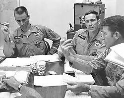Schirra, Eisele, and Cunningham were first named as an Apollo crew on September 29, 1966. They were to fly a second Earth orbital test of the Apollo Command Module (CM).[13] Although delighted as a rookie to be assigned to a prime crew without having served as a backup, Cunningham was troubled by the fact that a second Earth orbital test flight, dubbed Apollo 2, seemed unnecessary if Apollo 1 was successful. He learned later that Director of Flight Crew Operations Deke Slayton, another of the Mercury Seven who had been grounded for medical reasons and supervised the astronauts, planned, with Schirra's support, to command the mission if he gained medical clearance. When this was not forthcoming, Schirra remained in command of the crew, and in November 1966, Apollo 2 was cancelled and Schirra's crew assigned as backup to Grissom's.[14] Thomas P. Stafford—assigned at that point as the backup commander of the second orbital test—stated that the cancellation followed Schirra and his crew submitting a list of demands to NASA management (Schirra wanted the mission to include a lunar module and a CM capable of docking with it), and that the assignment as backups left Schirra complaining that Slayton and Chief Astronaut Alan Shepard had destroyed his career.[15]
