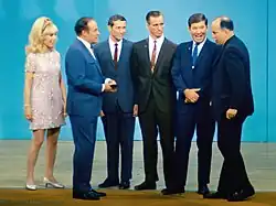 The first television broadcast took place on October 14. It began with a view of a card reading "From the Lovely Apollo Room high atop everything", recalling tag lines used by band leaders on 1930s radio broadcasts. Cunningham served as camera operator with Eisele as emcee. During the seven-minute broadcast, the crew showed off the spacecraft and gave the audience views of the southern United States. Before the close, Schirra held another sign, "Keep those cards and letters coming in folks", another old-time radio tag line that had been used recently by Dean Martin.[63] This was the first live television broadcast from an American spacecraft (Gordon Cooper had transmitted slow-scan television pictures from Faith 7 in 1963, but the pictures were of poor quality and were never broadcast).[64] According to Jones, "these apparently amiable astronauts delivered to NASA a solid public relations coup."[28] Daily television broadcasts of about 10 minutes each followed, during which the crew held up more signs and educated their audience about spaceflight; after the return to Earth, they were awarded a special Emmy for the telecasts.[65]