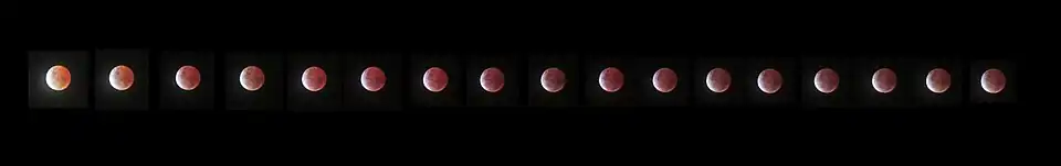 Totality lasted only 4 minutes and 43 seconds,[4] making it the shortest lunar totality in almost five centuries since October 17, 1529 (which lasted 1 minute and 42 seconds). It was claimed by some that due to the oblateness of the Earth, it may have actually just been a partial eclipse.[5] It was the sixth total lunar eclipse out of nine with totality under 5 minutes in a five millennium period between 2,000 BC and 3,000 AD. The eclipsed moon was 12.9% smaller in apparent diameter than the supermoon September 2015 lunar eclipse, measured as 29.66' and 33.47' in diameter from the center of the Earth. It occurred 3 days past apogee at 29.42'.