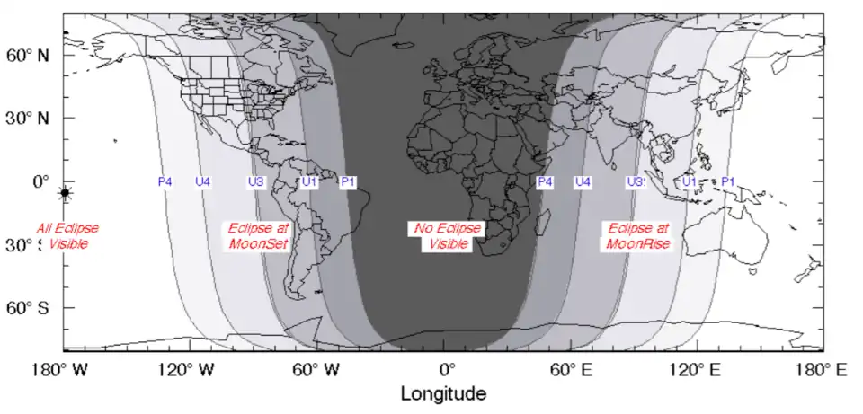 The eclipse was completely visible over northeast Asia, eastern Australia, the Pacific Ocean, and western North America, seen rising over Asia and western Australia and setting over North and South America.[7]