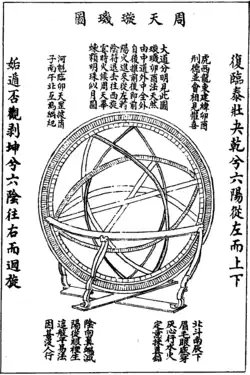 According to Joseph Needham, the earliest development of the armillary sphere in China goes back to the astronomers Shi Shen and Gan De in the 4th century BC, as they were equipped with a primitive single-ring armillary instrument.[3] This would have allowed them to measure the north polar distance (declination) a measurement that gave the position in a xiu (right ascension).[3] Needham's 4th century BC dating, however, is rejected by British sinologist Christopher Cullen, who traces the beginnings of these devices to the 1st century BC.[4]