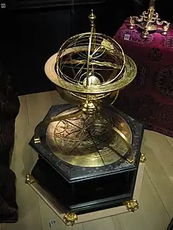 Further advances in this instrument were made by Danish astronomer Tycho Brahe (1546–1601), who constructed three large armillary spheres which he used for highly precise measurements of the positions of the stars and planets. They were described in his Astronomiae Instauratae Mechanica.[23]