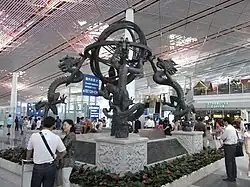 The Beijing Capital International Airport Terminal 3 features a large armillary sphere metal sculpture as an exhibit of Chinese inventions for international and domestic visitors.