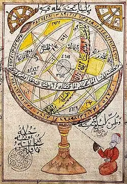 Persian and Arab astronomers such as Ibrahim al-Fazari and Abbas Ibn Firnas continued to build and improve on armillary spheres. The spherical astrolabe, a variation of both the astrolabe and the armillary sphere, was likely invented during the Middle Ages in the Middle East.[19] About 550 AD, Christian philosopher John Philoponus wrote a treatise on the astrolabe in Greek, which is the earliest extant treatise on the instrument.[20] The earliest description of the spherical astrolabe dates back to the Persian astronomer Nayrizi (fl. 892–902). Pope Sylvester II applied the use of sighting tubes with his armillary sphere in order to fix the position of the pole star and record measurements for the tropics and equator, and used armillary spheres as a teaching device.[21]