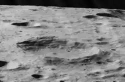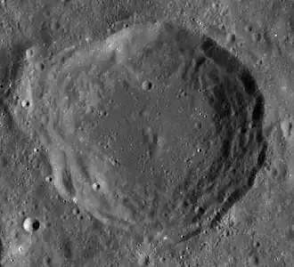 Artemʹev is a lunar impact crater that is located on the far side of the Moon. The rim of this crater has been modified by subsequent impacts in the vicinity, with an inward bulge along the southwest edge and a worn impact lying across the north rim. The satellite crater Artemʹev G is partly overlain by the southeast rim of Artemʹev. The crater interior is relatively flat, and marked only by tiny craterlets.