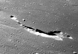 Aryabhata, named after Indian astronomer Aryabhata,[2] is the remnant of a lunar impact crater located in the eastern Mare Tranquillitatis. The crater has been almost submerged by lava-flow, and now only an arc-shaped ridge formed from the eastern half of the rim remains above the lunar mare. This crater was previously identified as Maskelyne E before being named by the IAU in 1979. Maskelyne itself is to the southwest.