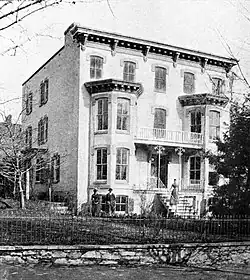 Hall's childhood home, in the Georgetown neighborhood of Washington, D.C. Note his mother Angeline on front steps, and two Black workers. The house later served as the parsonage and fellowship hall of Alexander Memorial Baptist Church.