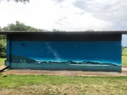 A colorful mural covers the exterior north side of the building. The 270 square foot mural, commissioned by the Jasper County Conservation Department, depicts the southern night sky as seen from the observatory including the planet positions at the time of the mural's creation (summer 2019) over a prairie scene. The stars and planets were painted with phosphorescent paint, making them visible in the dark after sunset. The mural was created by local artists Lauren Roush and Pauli Zmolek from Newton. Ms Roush, an art teacher, recruited around 40 young students to help in the early stages of painting on site. It was dedicated on September 7, 2019.[3]