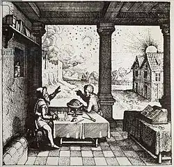 Ephemerides with complex astrological calculations, and almanacs interpreting celestial events for use in medicine and for choosing times to plant crops, were popular in Elizabethan England.[87] In 1597, the English mathematician and physician Thomas Hood made a set of paper instruments that used revolving overlays to help students work out relationships between fixed stars or constellations, the midheaven, and the twelve astrological houses.[88] Hood's instruments also illustrated, for pedagogical purposes, the supposed relationships between the signs of the zodiac, the planets, and the parts of the human body adherents believed were governed by the planets and signs.[88][89] While Hood's presentation was innovative, his astrological information was largely standard and was taken from Gerard Mercator's astrological disc made in 1551, or a source used by Mercator.[90][91] Despite its popularity, Renaissance astrology had what historian Gabor Almasi calls "elite debate", exemplified by the polemical letters of Swiss physician Thomas Erastus who fought against astrology, calling it "vanity" and "superstition." Then around the time of the new star of 1572 and the comet of 1577 there began what Almasi calls an "extended epistemological reform" which began the process of excluding religion, astrology and anthropocentrism from scientific debate.[92] By 1679, the yearly publication La Connoissance des temps eschewed astrology as a legitimate topic.[93]