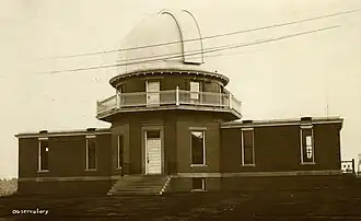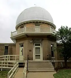 The building, itself, is in a traditional observatory design, Colonial Revival style, following a T-plan. The dome rises 35 feet (11 m) in the air.[6] The observatory was built on a one-story T-plan, facing north, of buff-colored Roman brick (from Indiana) and features limestone lintels and sills. The cross of the T is 75 feet (23 m) long east to west and 25 feet (7.6 m) deep, its stem is located to the south, centered along the east-west axis and is 26 feet (7.9 m) deep by 25 feet (7.6 m) wide. The octagonal observation tower rises 25 feet (7.6 m) into the air at the intersection of the T where it becomes a dome and continues to a height of 35 feet (11 m). At floor level of the second equatorial room a balustrade circles around the exterior of the tower. The tower is capped by a great circular limestone plate, which carries the dome track. Internally, the diameter of the dome is 24.5 feet (7.5 m) and its zenith 24 feet (7.3 m) above the floor. The dome slit, which still operates, has an opening of 44 inches (1,100 mm) and can be opened or closed by hand in seconds. The dome tower and equatorial room are original save a motor drive which replaced the old rope and sheave method of rotating the dome.[6] As of September 2014, the motor drive was being serviced and the rope and sheave method was once again in use.