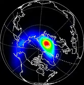 In this sample of images from 2004, bright X-ray arcs of low energy (0.1 – 10 keV) are generated during auroral activity. The images are superimposed on a simulated image of Earth. The color code of the X-ray arcs represent brightness, with maximum brightness shown in red. Distance from the North pole to the black circle is 3,340 km (2,080 mi). Observation dates: 10 pointings between 16 December 2003 – 13 April 2004. Instrument: HRC.